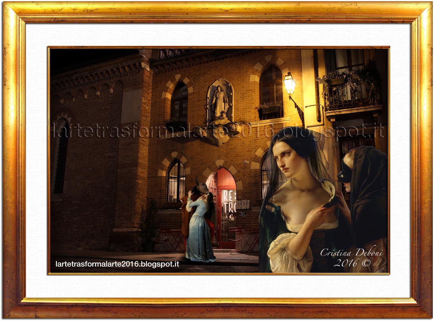 In questo post ho ripreso la bella immagine di due innamorati del dipinto del "Il Bacio" di Francesco Hayez realizzato nel 1859 e in primo piano, sempre di Francesco Hayez, "Il consiglio alla vendetta" del 1851 e li ho inseriti nella quotidianità della città di Verona e più precisamente presso una trattoria vicino al Duomo di Verona.